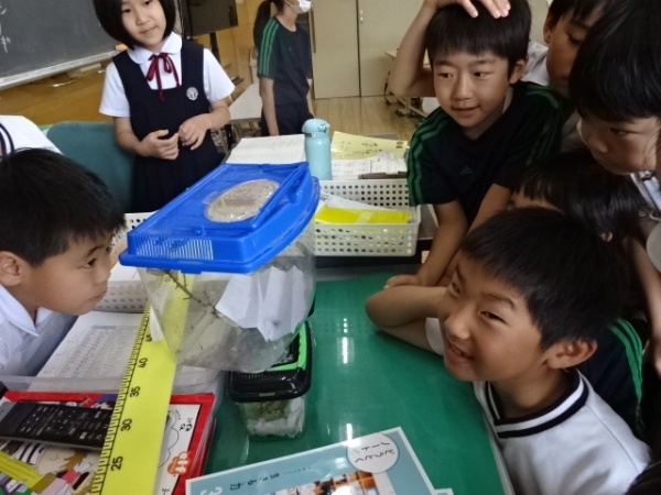 最近は、毎日教卓の上に置いてある水槽を見に来て、幼虫やさなぎの様子について