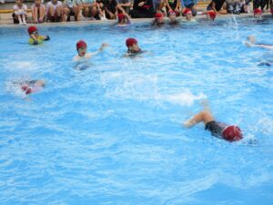 いつもの水泳の授業とは違う格好ですから、みんな戸惑いながら入水します。