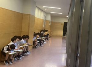 職員室に戻る途中で・・・おや?1年生が光の庭の横に並んでいます。