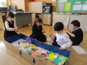 あそびの国は、段ボールやペットボトルや巻き芯等、身近にある物でゲームを作り遊ぶ授業です。