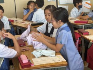 「ちっちゃーい!」「かわいい!」「この間まで妹が着てた下着だ!」などの感想が飛び交ったり、赤ちゃんの下着を自分の体に当ててみて、その小ささに驚いたり、赤ちゃんのデリケートな肌用に縫い目やタグなどが外側についている下着の工夫を目で見て学ぶことができました。