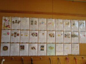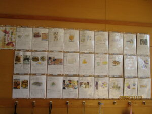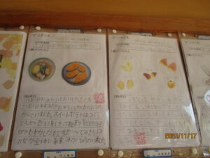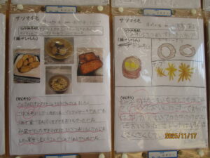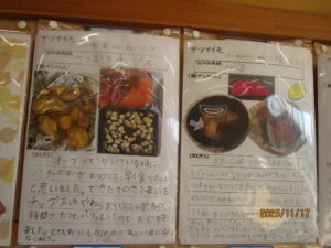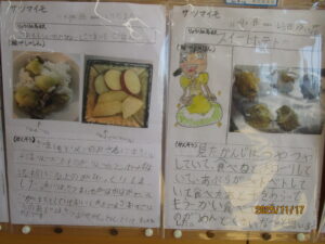 教室には、先日の遠足で掘ったさつまいもを使って作った、子どもたちの料理の掲示が賑やかに飾られています。