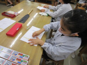 図工室に入ると、子どもたちは作品を制作するために設計図を書いていきます。