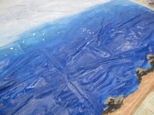 まずは海の水の色をイメージして、濃い青と薄い青のペンキを塗ります。