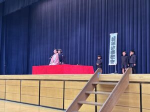 今回の芸術鑑賞会は落語“体験”ということなので、選ばれた5人の子どもたちが、4つの中から1つを選んで演技をしてみました。どの子も堂々と演じていて、かっこよかったです。