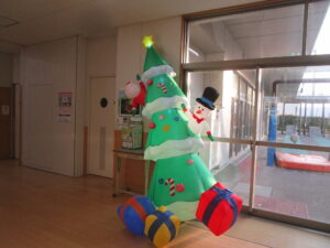 大きなサンタクロースやクリスマスツリーのバルーンの置物があります。