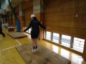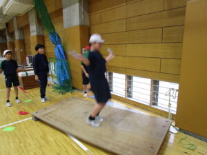 二重跳びに挑戦したい児童は、ジャンプ台を使って感覚をつかんでいます。バランスを取るのは少し難しいですが、高く跳ぶ感覚をつかむことができ、二重跳びの習得に役立ちます。