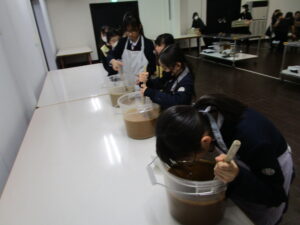 原料の大豆と小麦に麹菌を加えて作るしょう油麹やしょう油麹に食塩水を加えて作ったもろみが発酵を経て、姿を変えていく様子を見て学び、説明を聞いて学び、においをかいで学びました。体験では、原料やしょう油麹を手で触ったり、もろみを絞ったり実物に触れて学び、最後に、しょう油を自分で付けてその場で焼いた美味しいしょう油せんべいを食べて舌で学びました。