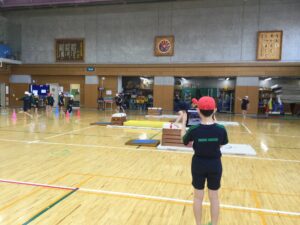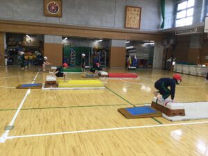 授業では、まず「うさぎ跳び」などの感覚づくり運動からスタートし、手で体を支えるリズムを整えます。その後は自分たちで協力して準備を行い、段数やマットの厚さが異なる4つの練習場所から、自分の力に合った「場」を選んで練習を開始します。開脚とびと抱え込みとび、それぞれの目標に向かって試行錯誤する姿は真剣そのものです。