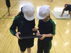 今回の学習の大きな特徴は、タブレットをフル活用した「学び合い」です。ペアでお互いの跳ぶ様子を撮影し合い、その場ですぐに動画をチェック。