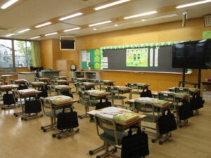 1年生の教室には机の上にピシッと並んだお手紙と、真新しい補助バッグが!