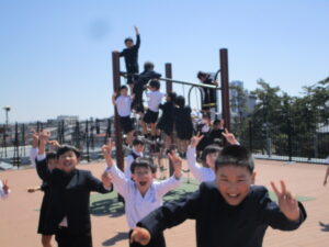 上級生のお兄さんやお姉さんが楽しそうに遊んでいた、大きなグラウンドやウッドデッキでも遊べるようになりました。中学年用のウッドデッキに出ると、4年生と3年生が楽しそうに遊んでいました。
