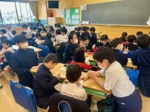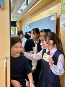 The grade 6 students kneel down next to the grade 2 students` desks. They exchange postcards.