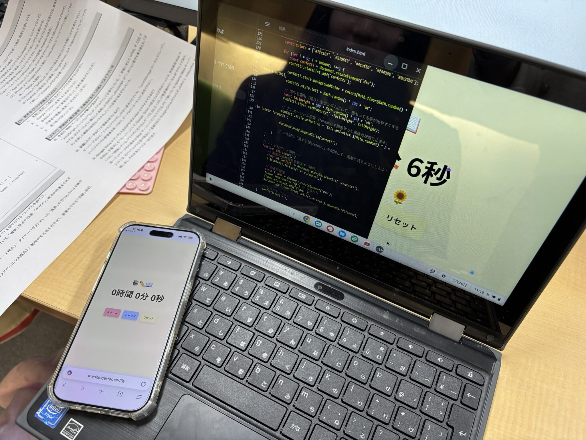 情報Ⅰの授業において、生成AIを活用したスマホアプリ開発の実習を2時間完結(クラスによっては1時間に短縮)で行いました。今回の授業では、HTML,CSS,JavaScriptで作成した「勉強タイマー」を題材に、生成AI(Gemini)を活用しながらUI/UXの改善に取り組んでいきます。