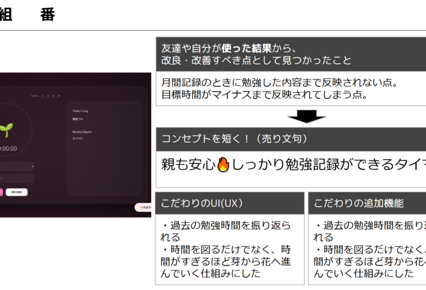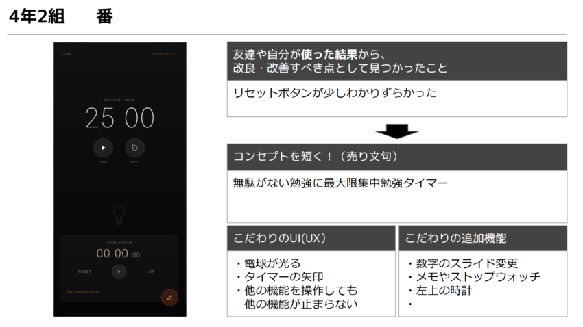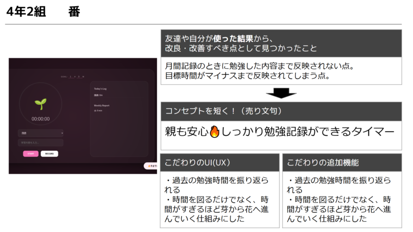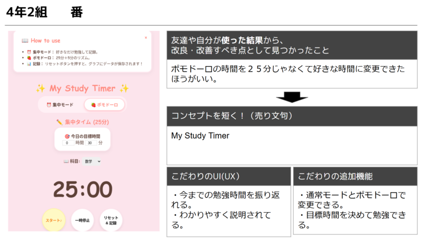 作成の中で、同じ「勉強タイマー」という題材でも、何を大切にするかによってアプリの姿が大きく変わることを、生徒自身が実感していました。