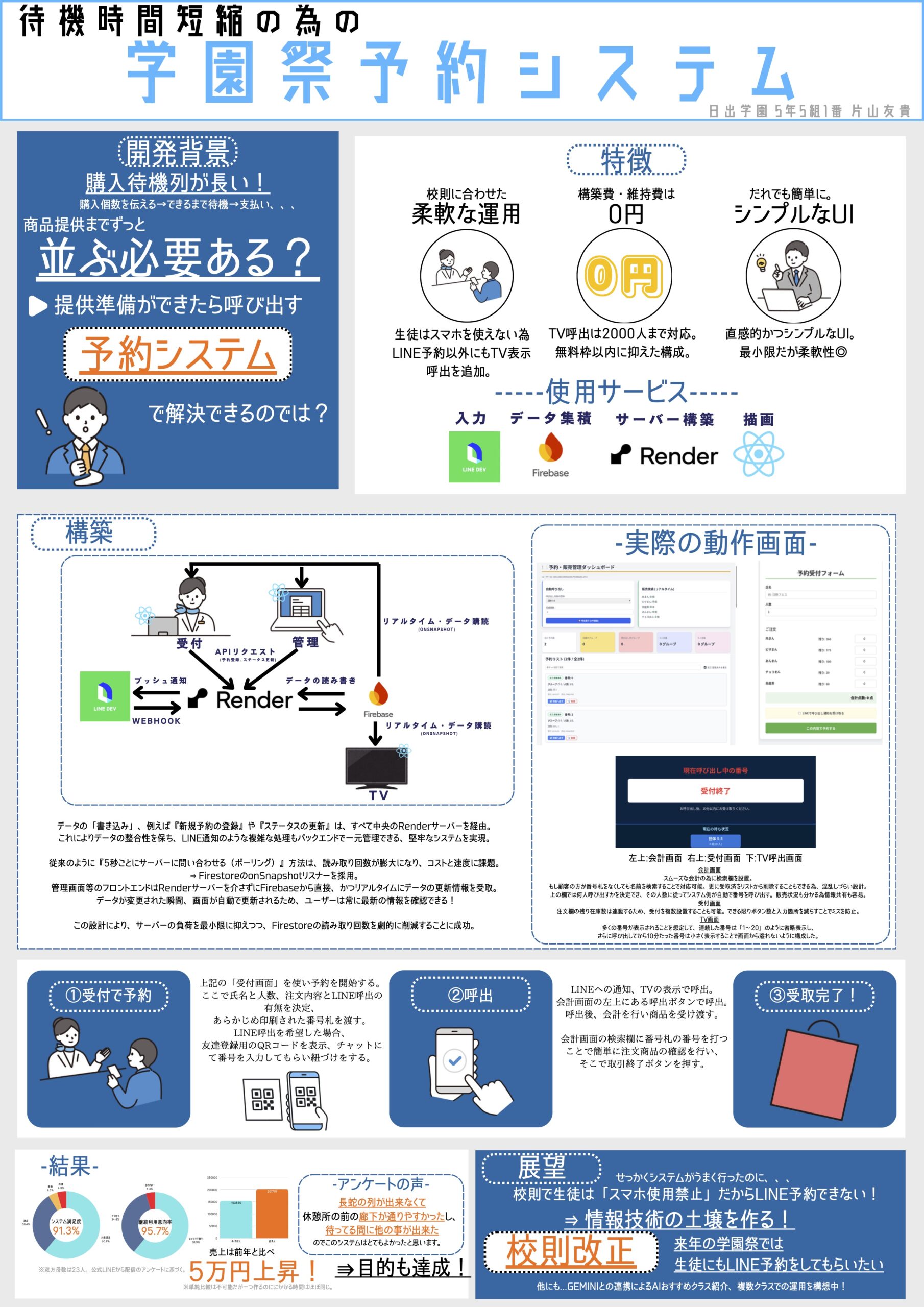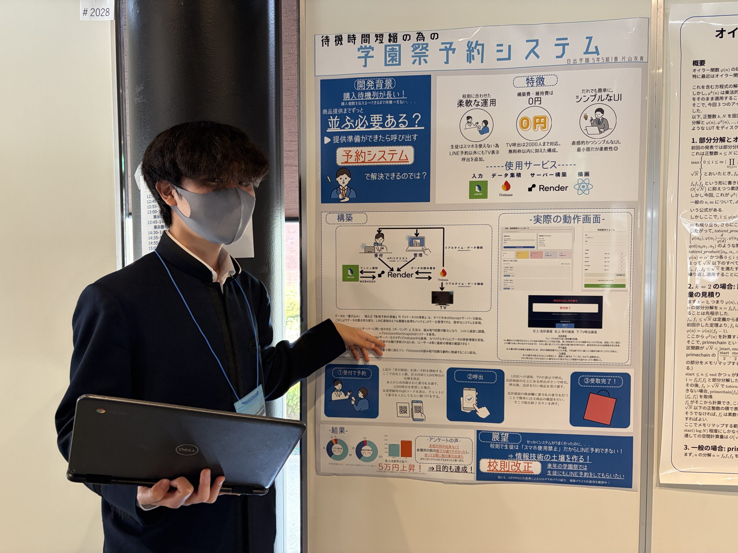 この研究は、本校の文化祭「日出祭」で実際に運用されたシステムをもとにしたもので、来場者の待機時間を減らすことを目的に開発された予約システムです。