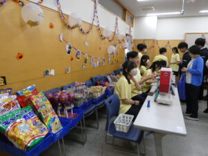 教室にぐるりと並べられた駄菓子を買いに、多くの人が訪れていました。