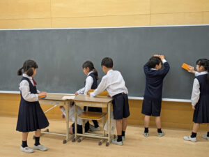 10分間掃除。ほうきや雑巾でテキパキ掃除します。掃除が終わると5時間目が始まります。