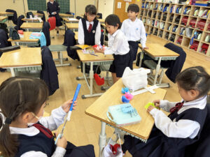 昼休みスタート。教室で工作を楽しんでいる子どもたち。