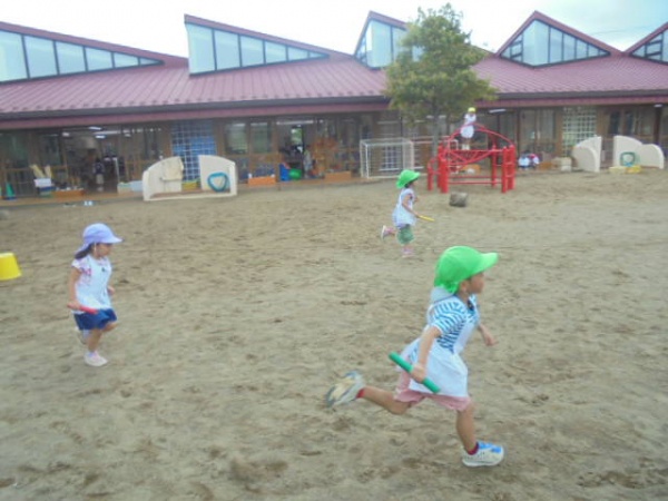 年長さんたち、園庭では自分たちでリレーを始めていました。