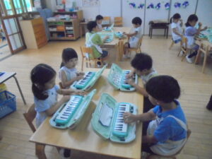 ふじ組さんの鍵盤ハーモニカ、新しい「ミ」のシールを貼ってもらっていました。