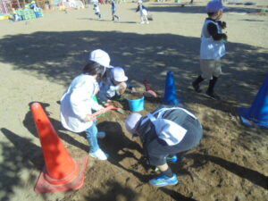 少し気温が上がってから、年中と年少はチューリップの球根植えをしました。