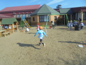 さて、年長さんでは凧がだんだん完成してきて、外で揚げている子たちがいました。朝はあまり風がなくて、一生懸命走っていました。午後は少し風が出ていました。