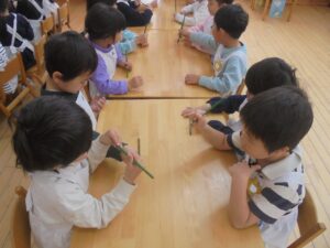 年中組では、ワークタイムが始まりました。鉛筆の持ち方をやっていました。