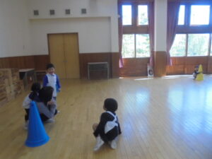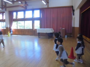 朝から外でも結構遊べた年少さんですが、室内でも元気いっぱいですね。広いホールで走り回ってよかったです。