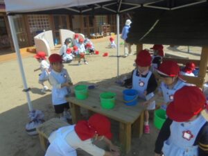 バケツとシャベルを持ったら、すぐに砂遊びが始まりました。