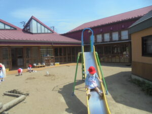 幼稚園では、滑り台の下から登るのはなしにしています。