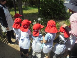 年少さんもだんだん遊ぶ場所が広くなってきました。今日はみんなで池を見物。
