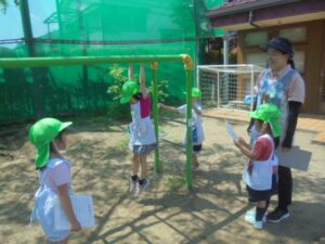 スキップとか、うんていを一つすすむとか、ボールを投げて取る、10秒ぶら下がるなどです。口々に「見て」と先生に言ってやっていました。