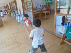 お友だちと一緒に回るところは、みんな笑ってしまって、「アハハハハ!」とうまく回れていませんでした。いいですね、仲良しです。