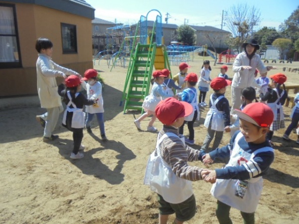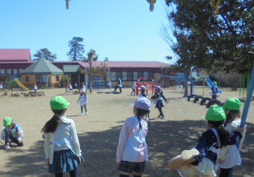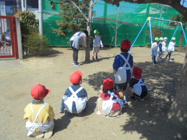 年少さんは、学期末でも比較的のんびりしていますが、外での集団遊びの時間がありました。