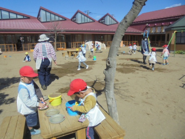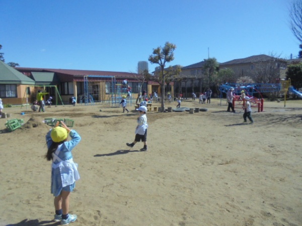園庭を広く使って縦横無尽に走るので、ちょっと危ないなと思いましたが、異年齢で合同で楽しそうにやっているので見守っていました。